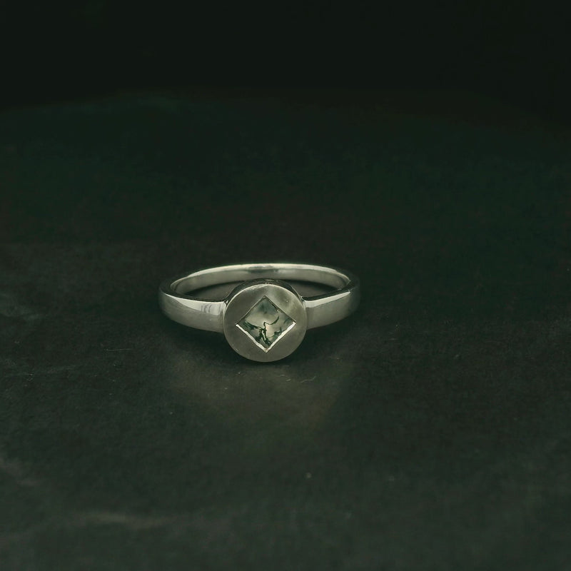 Embrace nature’s quiet elegance with this Round Moss Agate Signet Ring, a delicate fusion of geometry, earth, and light.