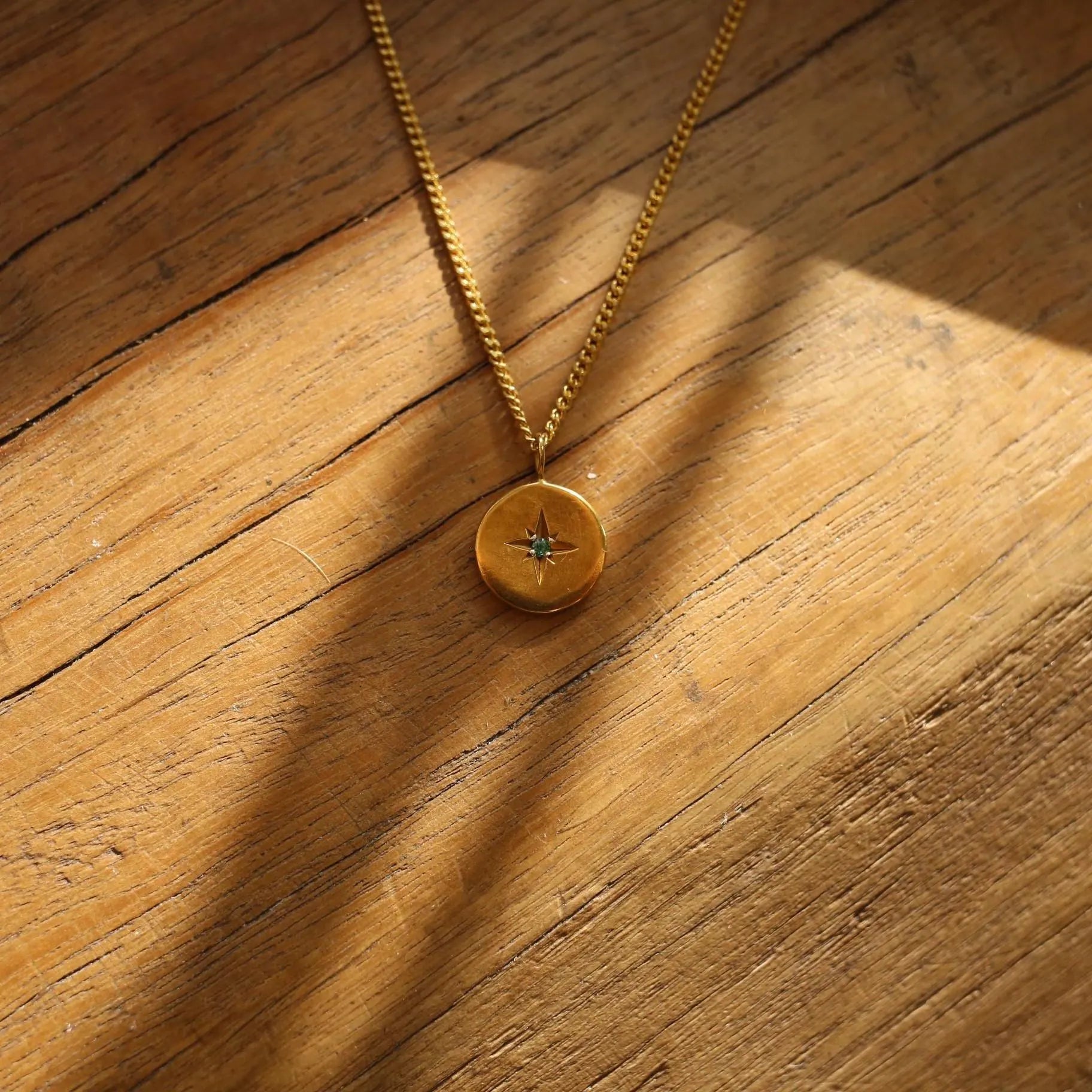 Each necklace is crafted in 18k Gold Vermeil—a thick 10-micron layer of gold over solid 925 sterling silver—designed for both beauty and durability. The coin pendant is finished with a hand-set gemstone, making every piece unique.