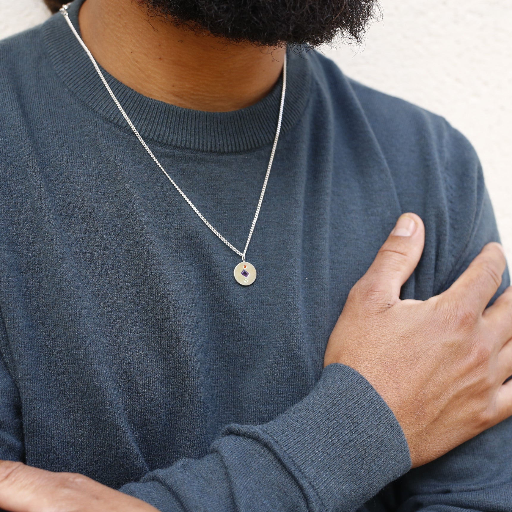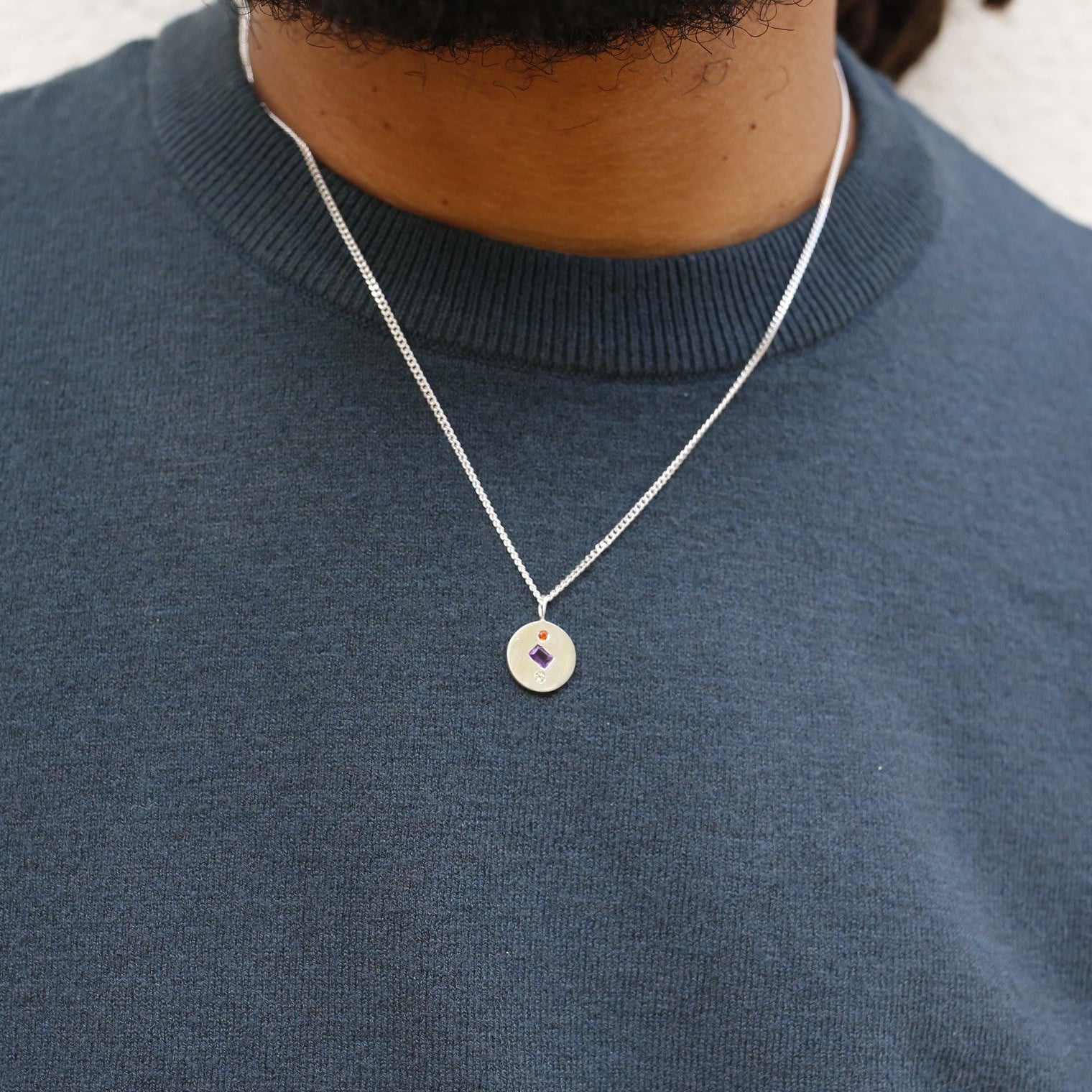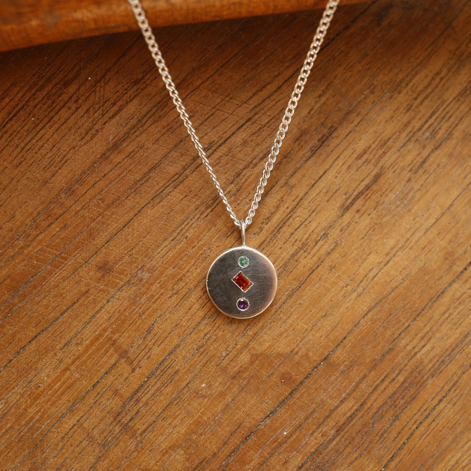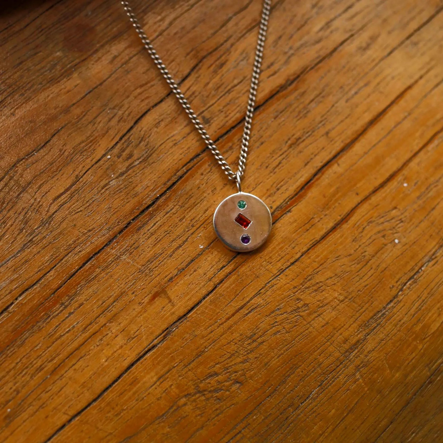 The sleek, round coin provides a versatile, modern canvas for the triad of gemstones. Whether layered with other necklaces or worn as a statement piece, this necklace blends timeless elegance with symbolic significance.Sustainably Made