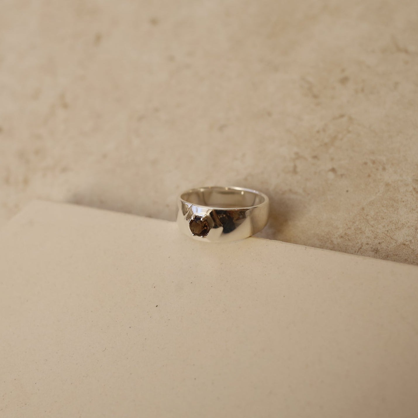Inspired by the bold sophistication of British antique rings, the Alma Ring blends heritage with a contemporary, genderless design. Crafted in sterling silver or gold vermeil, this solid band ring features a striking natural smoky quartz, a gemstone celebrated for its grounding energy and timeless beauty.