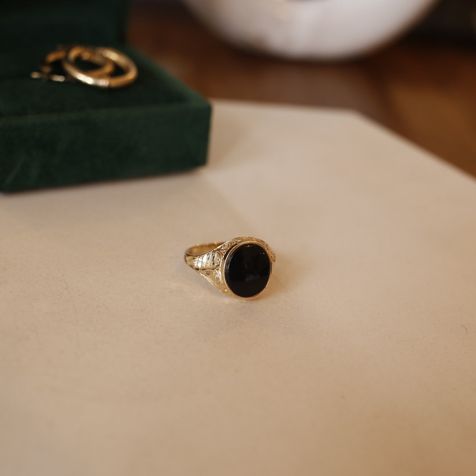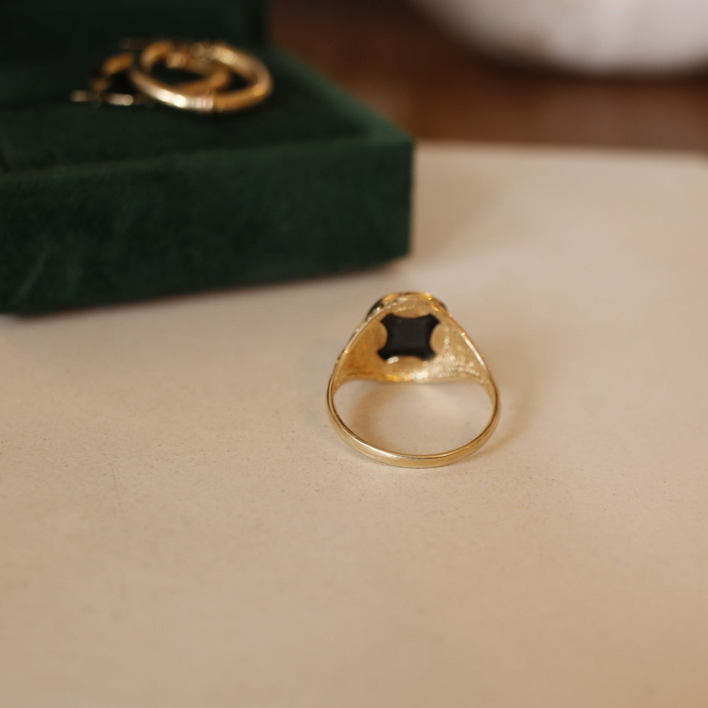 This striking vintage ring captures the bold elegance of 1980s design. Crafted in solid 9k yellow gold, it features a smooth, oval-cut black onyx set prominently at the centre. The deep, glossy onyx contrasts beautifully with the warm golden tones, creating a refined and timeless look. With its clean lines and subtle detailing along the shoulders, this piece embodies the minimal-yet-statement style characteristic of the era. A perfect choice for anyone who appreciates vintage craftsmanship and distinctive, understated luxury.