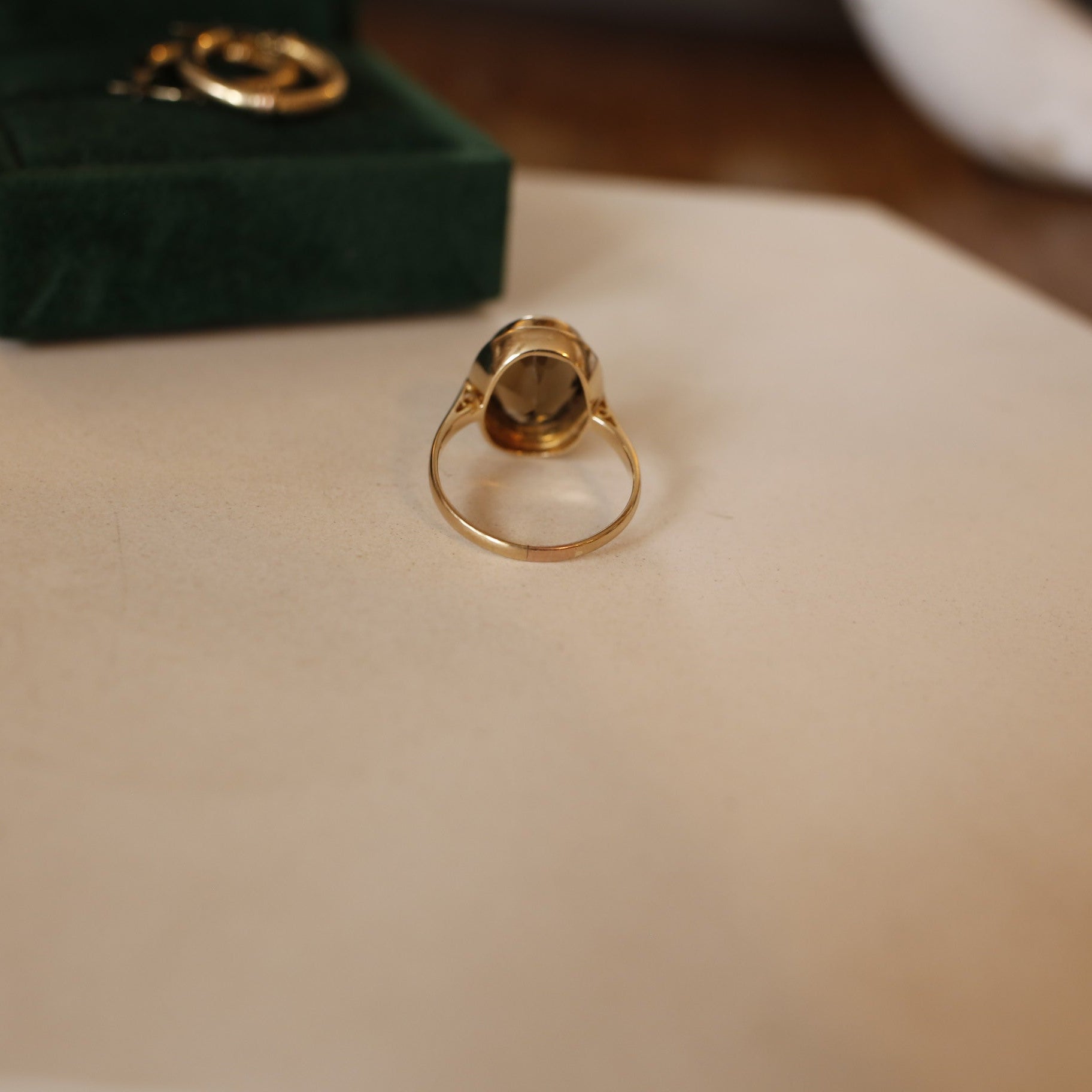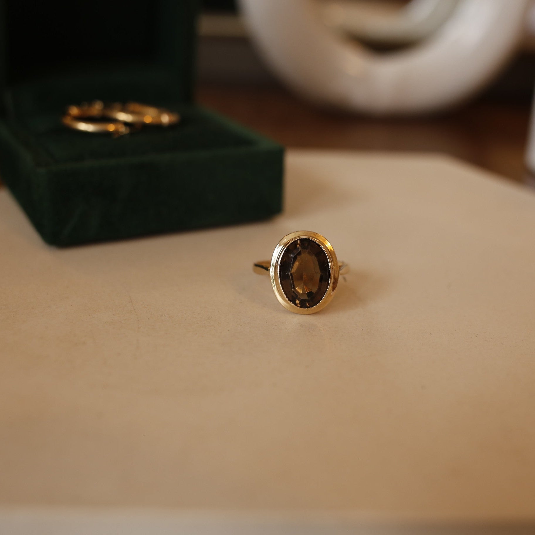 This vintage signet ring is crafted in solid 9-carat gold and set with an oval smoky quartz gemstone. It combines traditional design with a clean, timeless look suitable for everyday wear or collection.